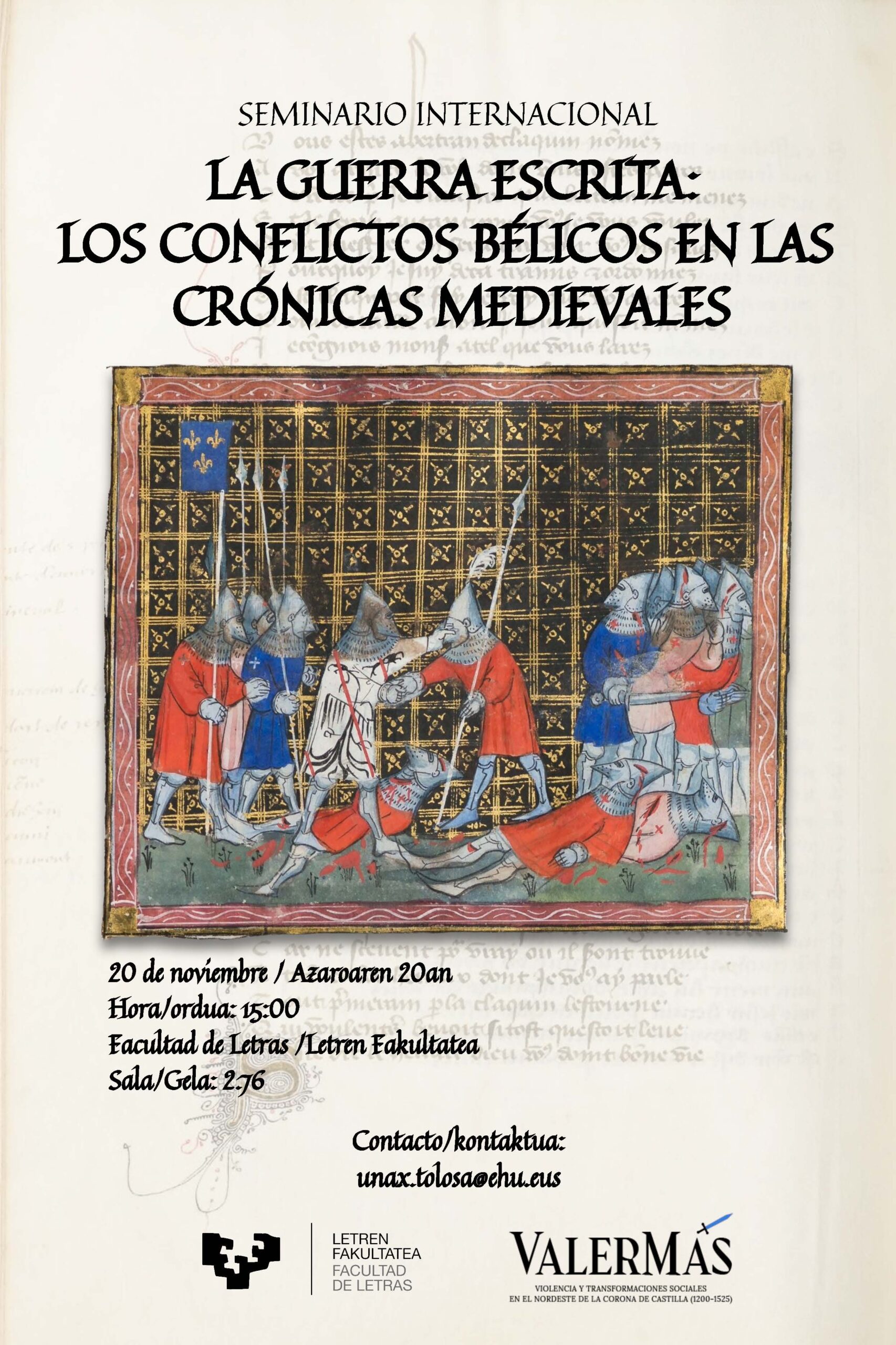 Organizado por nuestros compañeros Ekaitz Etxeberria Gallastegi y Unax Tolosa Pereda, el Seminario Internacional «La guerra escrita: los conflictos bélicos en las crónicas medievales» tendrá lugar el jueves 20 de noviembre de 2025 en la Sala 2.76 de la Facultad de Letras de la UPV/EHU (Vitoria-Gasteiz).